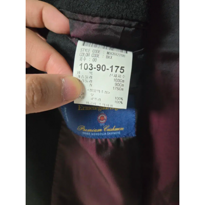 색상은 블랙이고, 사이즈는 103-90-175입니다. 키 170이상, 100-105 입으시는 분들에게 잘 맞습니다. 부드러운 캐시미어 소재로 고급스러워요
