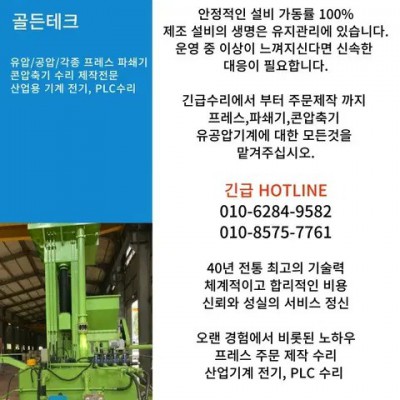 창녕 대합산업단지에 위치한 유공압 기계 제작 프레스 파쇄기 압축기 산업용 기계 전기 수리 PLC 수리 전문 각종 기계 이전 설치 대구 경북 경남 등 전지역 출장 견적 수리 가능 40년 경력 유압/공압/각종 프레스,파쇄기 콘압축기 수리 제작전문 산업용 기계 전기, PLC 수리 안정적인 설비 가동률 100% 제조 설비의 생명은 유지관리에 있습니다. 운영 중 이상이 느껴지신다면 신속한 대응이 필요합니다. 유압/공압/각종 프레스 파쇄기 콘압축기 수리 제작전문 산업용 기계 전기, PLC수리 긴급수리에서 부터 주문제작 까지 프레스,파쇄기,콘압축기 유공압기계에 대한 모든것을 맡겨주십시오. 골든테크 창녕군 대합면 대합산업단지로 22-16 055-532-1685 긴급 HOTLINE ***/****/**** ***/****/****