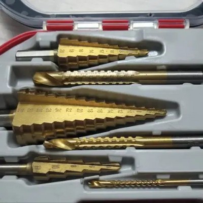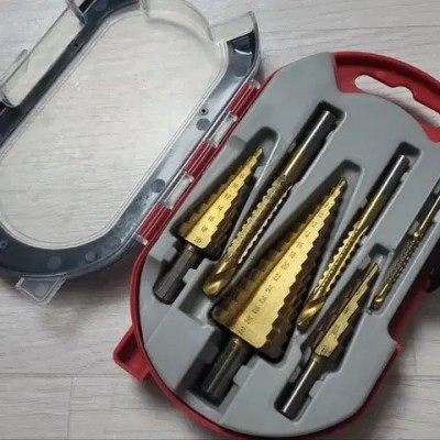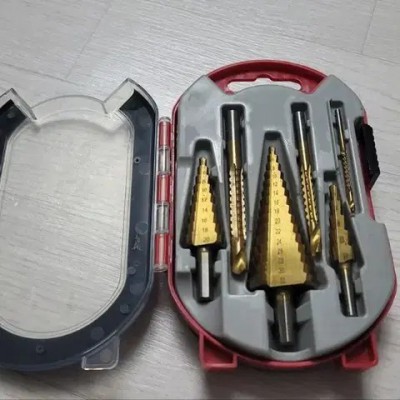 스텝드릴 세트 6P케이스 포함미사용 새제품 입니다직선 슬롯 티타늄 도금 스텝 드릴삼각형 생크4-12mm4-20mm4-32mm티타늄 도금톱 드릴 3, 6, 8mm 각각1개 입니다