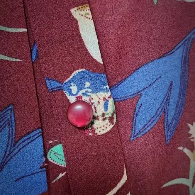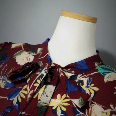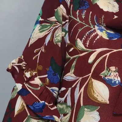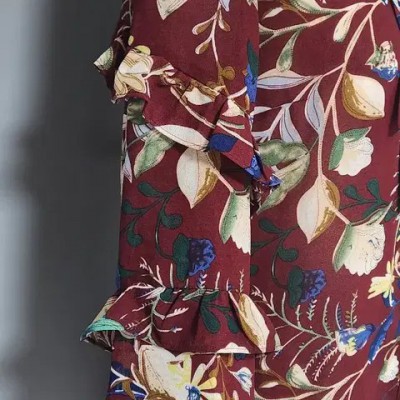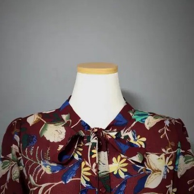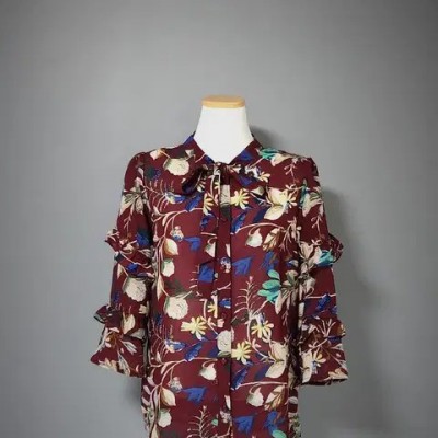 고급스러운 와인.버건디 계열의 바탕의 다채로운 플라워 프린트~리본 타이 디테일이 있는 라운드 넥으로 여성스러움 강조~3단 프릴 디테일이 돋보이는 7~8부 소매 우아한 실루엣으로 여유있는 루즈핏으로 체형커버에 좋고 뒷면 핀턱 주름 디테일로 고급스러움을 완성합니다~가슴둘레 47cm총장 64cm
