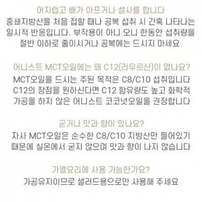 어니스트 코코넛 MCT 오일 판매합니다- 100% 코코넛 유래 MCT 오일 (C8 60%, C10 40%)- 1포당 10ml, 총 40포 구성식전이나 식후에 섭취해서 혈당 스파이크 방지해 주는 오일입니다. 체지방 감소와 신진대사에 도움이 된다고 해요. 다만 저는 몸에 안 맞는지 항상 섭 추할 때 마다 복통과 설사가 있어서;; 판매해요 한박스는 40포 그대로있고 나머지 한박스는 제가 좀 섭취해서 30포 있습니다